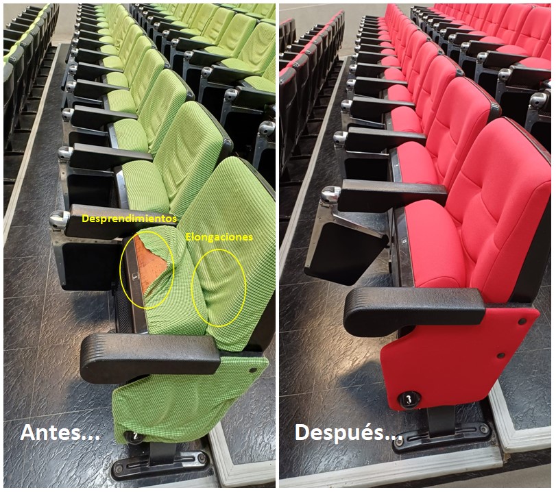 Muchas de estas butacas que presentan un alto porcentaje de elongación corren el riesgo de rotura en su tapicería, por lo que siempre recomendamos su retapizado lo antes posible sin dejar que haya rasgado. Este efecto causa muy mala impresión y son casos donde se evidencia el abandono y la falta de mantenimiento.
